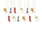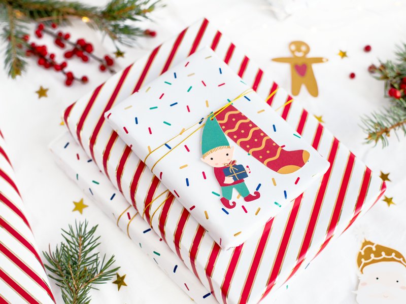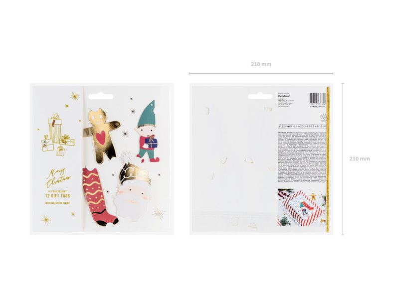 Dovanų etiketės Kalėdų Seneliui, pagamintos iš popieriaus, įvairių raštų. Rinkinyje yra 12 etikečių (4 dizainai, po 3 vnt. kiekvieno dizaino) ir 2,5 m auksinės virvelės. Etikečių dydis: apie 3,5–6,5 x 8–10 cm. (1 pakuotė / 12 vnt.)