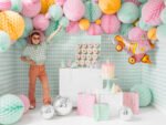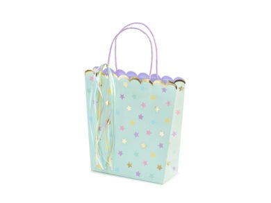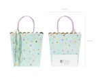 Mėtų spalvos dovanų maišeliai su spalvingais ir auksiniais metalo raštais, spalvingomis juostelėmis ir violetinės spalvos raštu maišelių viduje, dydis be rankenų apie 22 x 23 x 8 cm.