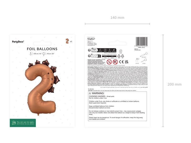 Folinis balionas Nr. 2 – rudos spalvos dinozauras, dydis prieš pripūtimą apie 105 cm (41 colio), dydis po pripūtimo apie 92 cm (36 coliai). Pripūskite oru ar heliu. Rinkinyje yra šiaudelis. Savaime užsisandarinantis balionas. Pridedami kabliukai lengvam tvirtinimui.