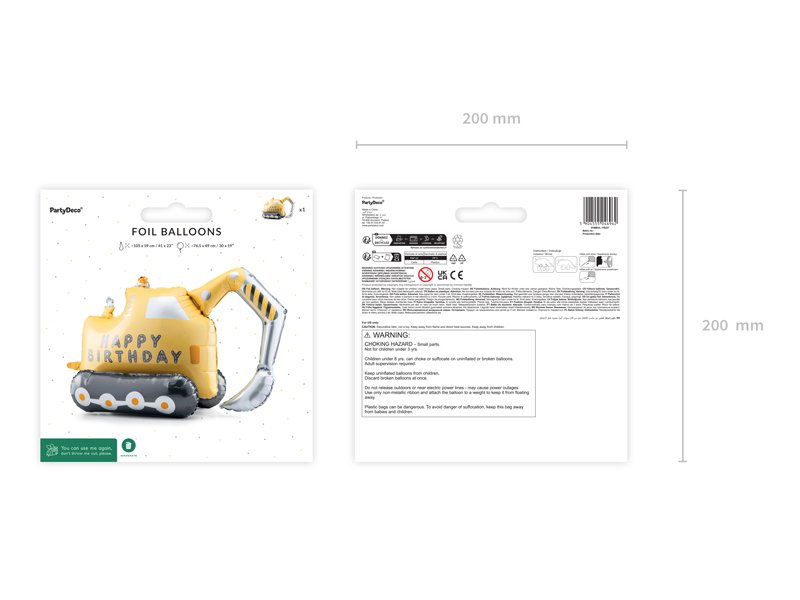 Stovintis folijos balionas „Ekskavatorius“, spalvų mišinys. Matmenys prieš pripūtimą: apie 59 x 105 cm, po pripūtimo: apie 76,5 x 49 cm. Pripūstas oru. Rinkinyje yra šiaudelis.
