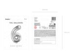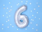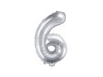 Metalinis Folinis balionas Skaičius „6“, sidabrinis, dydis prieš pripūtimą apie 40 cm (16 colių), dydis po pripūtimo apie 35 cm (14 colių). Pripūsti oru.