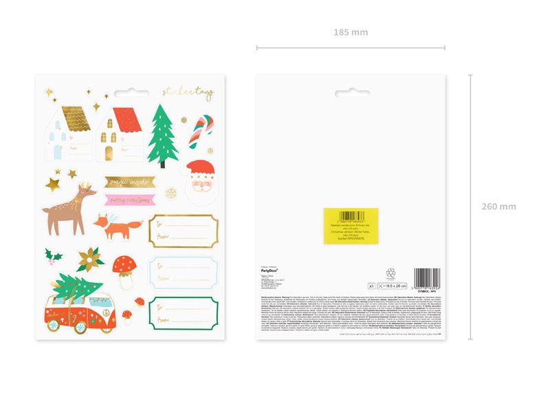 Kalėdiniai lipdukai „Žiemos miškas“, įvairių raštų ir spalvų, rinkinyje yra 20 lipdukų blisterinėje pakuotėje, kurių dydis maždaug 2–7 x 2–6,5 cm.