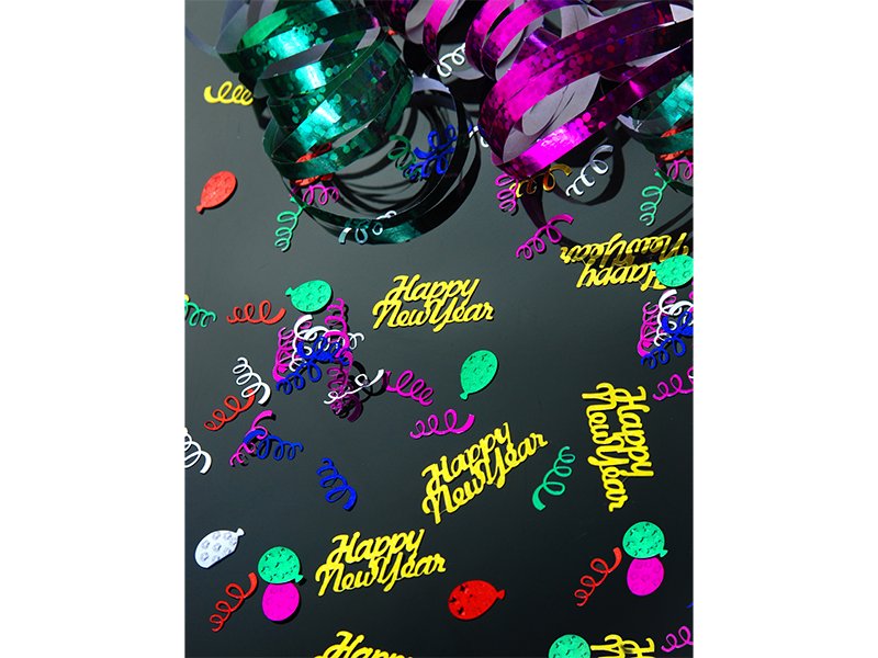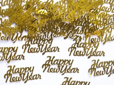 Foliniai konfeti „Su Naujaisiais metais“, auksiniai, 4×2 centimetrų dydžio.