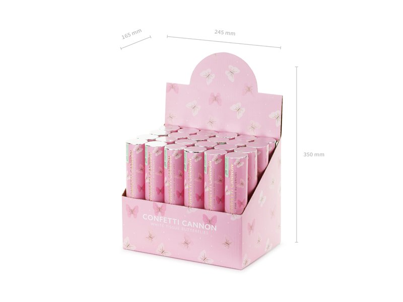 Konfeti patranka su skirtingų rožinių atspalvių drugeliais. Vamzdžio ilgis 20cm. Konfeti patranka nėra fejerverkas, joje yra suspausto oro. Šaudymo nuotolis: 5-8 metrai.
