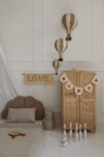 Sukurkite stilingą ir šiltą atmosferą vaikų kambaryje ar žaidimų erdvėje su šiuo ypatingai stilingu dekoratyviniu oro balionu. Rankų darbo balionas atrodo neįtikėtinai realistiškai – pintas krepšys, tvirtas balionas ir virvelės sukuria tikro oro baliono vaizdą. Balionas pagamintas iš itin kokybiškų medžiagų, todėl yra ilgaamžis ir lengvai tvirtinimas prie sienos arba lubų.