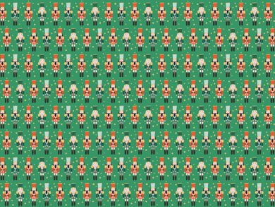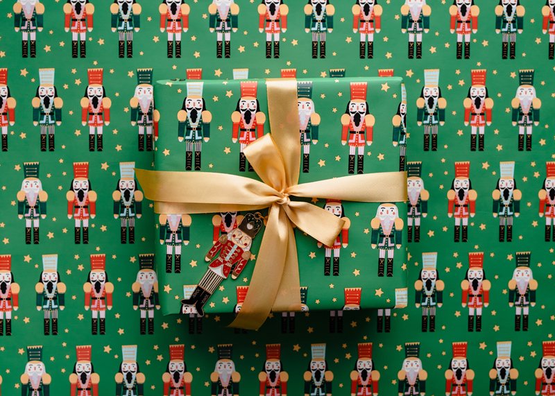 Pakavimo popierius – Žalios spalvos „Spragtukas“ su spalvingu raštu, dydis apie 70 x 200 cm.