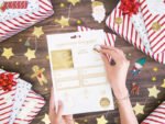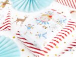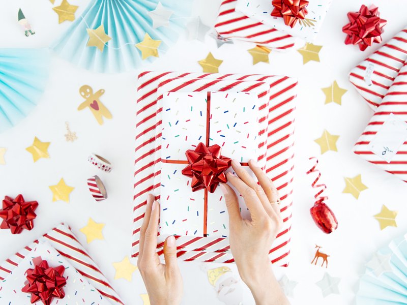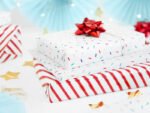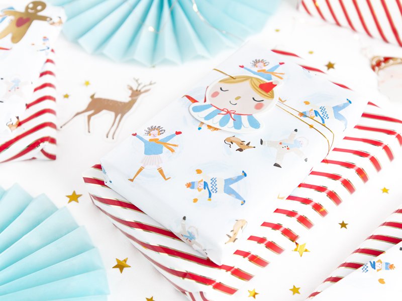 Dovanų popierius – baltos spalvos juostelės su raudonu ir auksiniu metalizuotu raštu, maždaug 70 x 200 cm dydis.