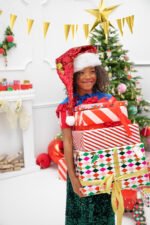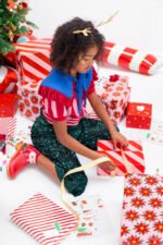 Pakavimo popierius – Šviesiai rožinės spalvos juostelės su raudonu raštu, dydis apie 70 x 200 cm.