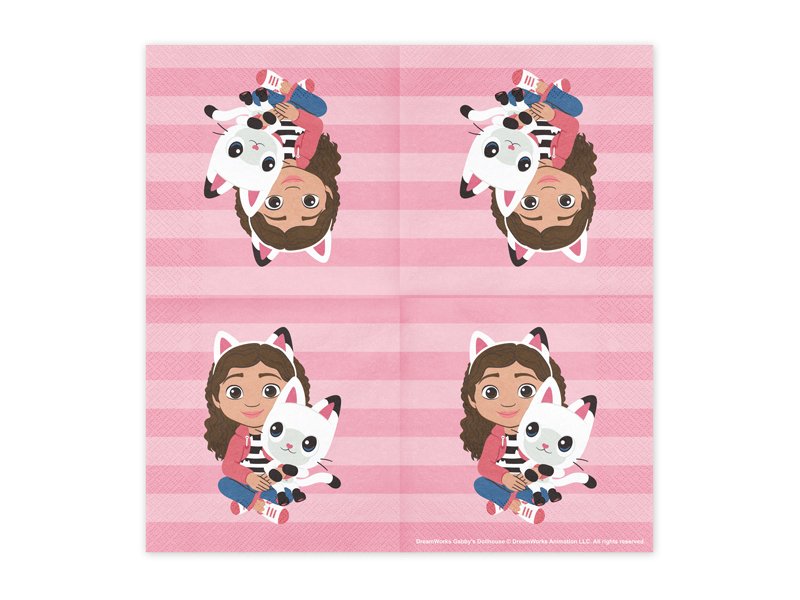 Popierinės servetėlės ​​„Gabby’s Dollhouse“, spalvų mišinys, dydis išskleidus apie 33 x 33 cm, dydis sulanksčius apie 16,5 x 16,5 cm. (1 pakelis / 20 vnt.)