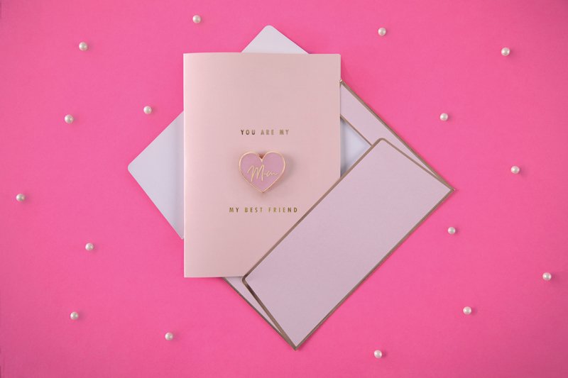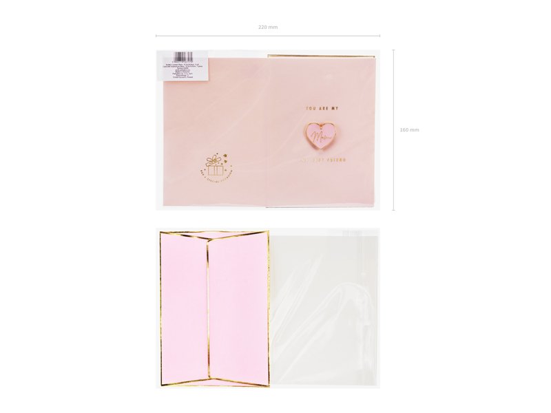 Rožinės spalvos atvirutė su aukso metalo atspaudu, emalio smeigtuku širdies formos su užrašu „Mom“ ir rožiniu voku su aukso metalo atspaudu. Atvirutės dydis apie 10,5 x 14,8 cm, emalio smeigtuko dydis apie 3 x 2,7 cm.